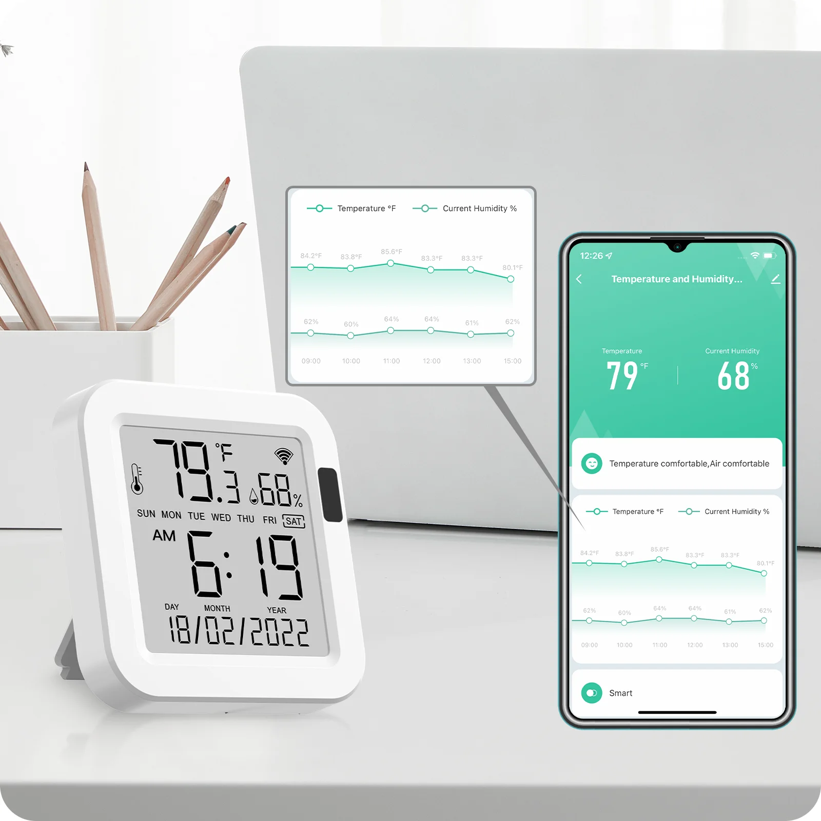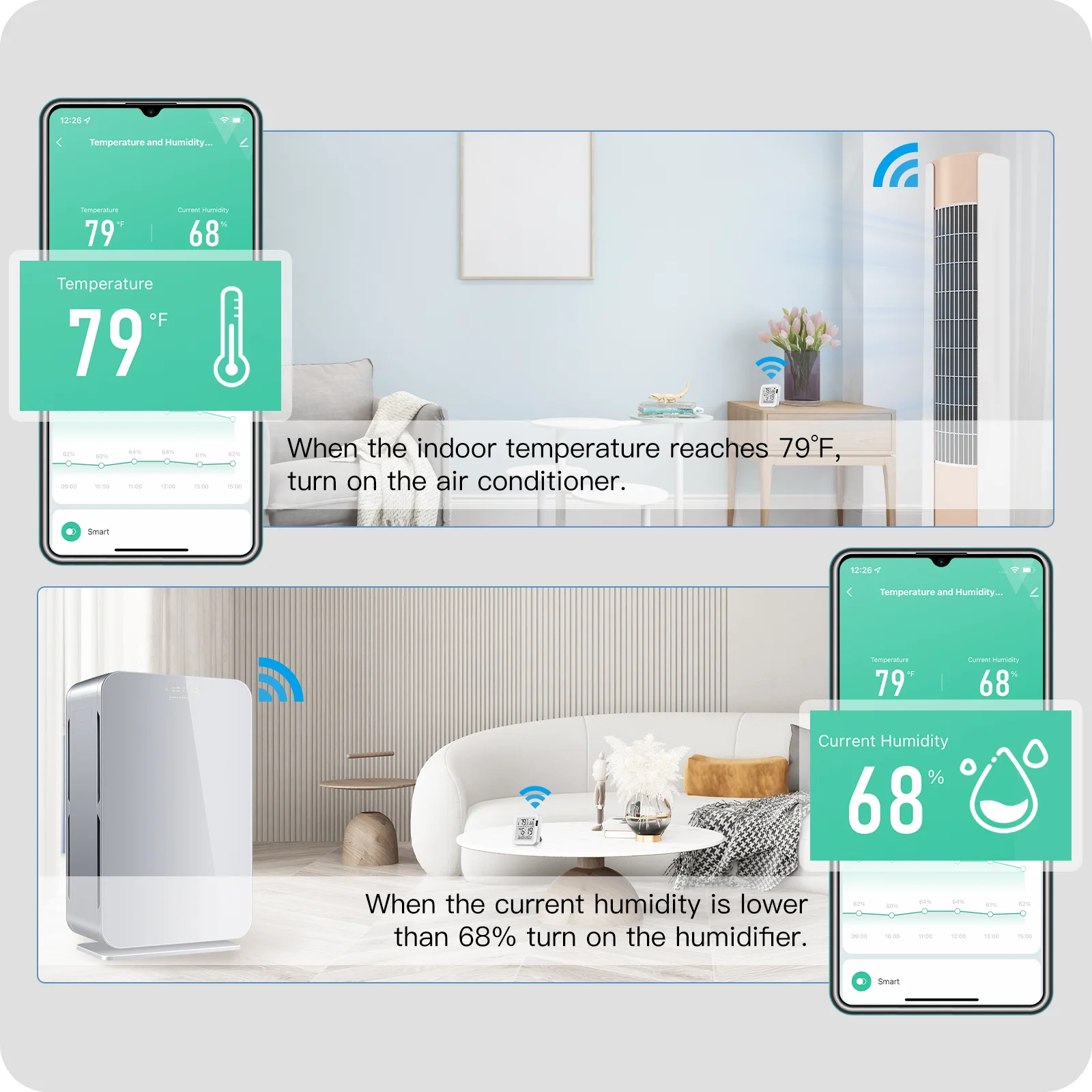 2. Compatible con la aplicación Tuya Smart/Smart Life: Controle inteligentemente los datos de temperatura y humedad por teléfono inteligente a través de la aplicación Tuya Smart sin necesidad de concentrador, funciona bien en la aplicación para verificar con el gráfico de datos por día, mes y registro de año. Incluso con la expresión facial como modo guardián para ofrecer el mejor aire y temperatura para el cuidado del bebé.