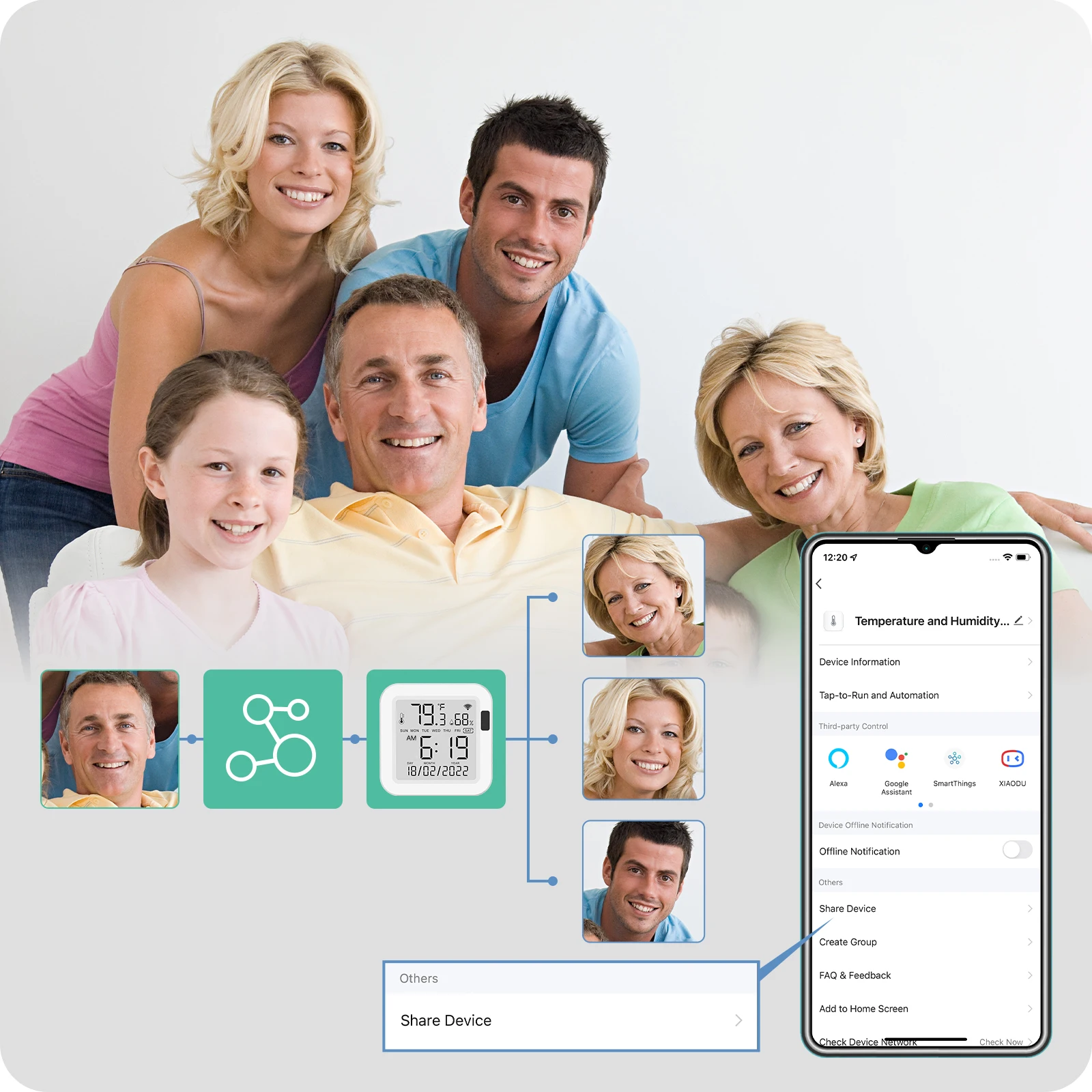 Comparta su sensor de temperatura y humedad adicional con los miembros de su familia, para que también puedan monitorear el ambiente interior en tiempo real.