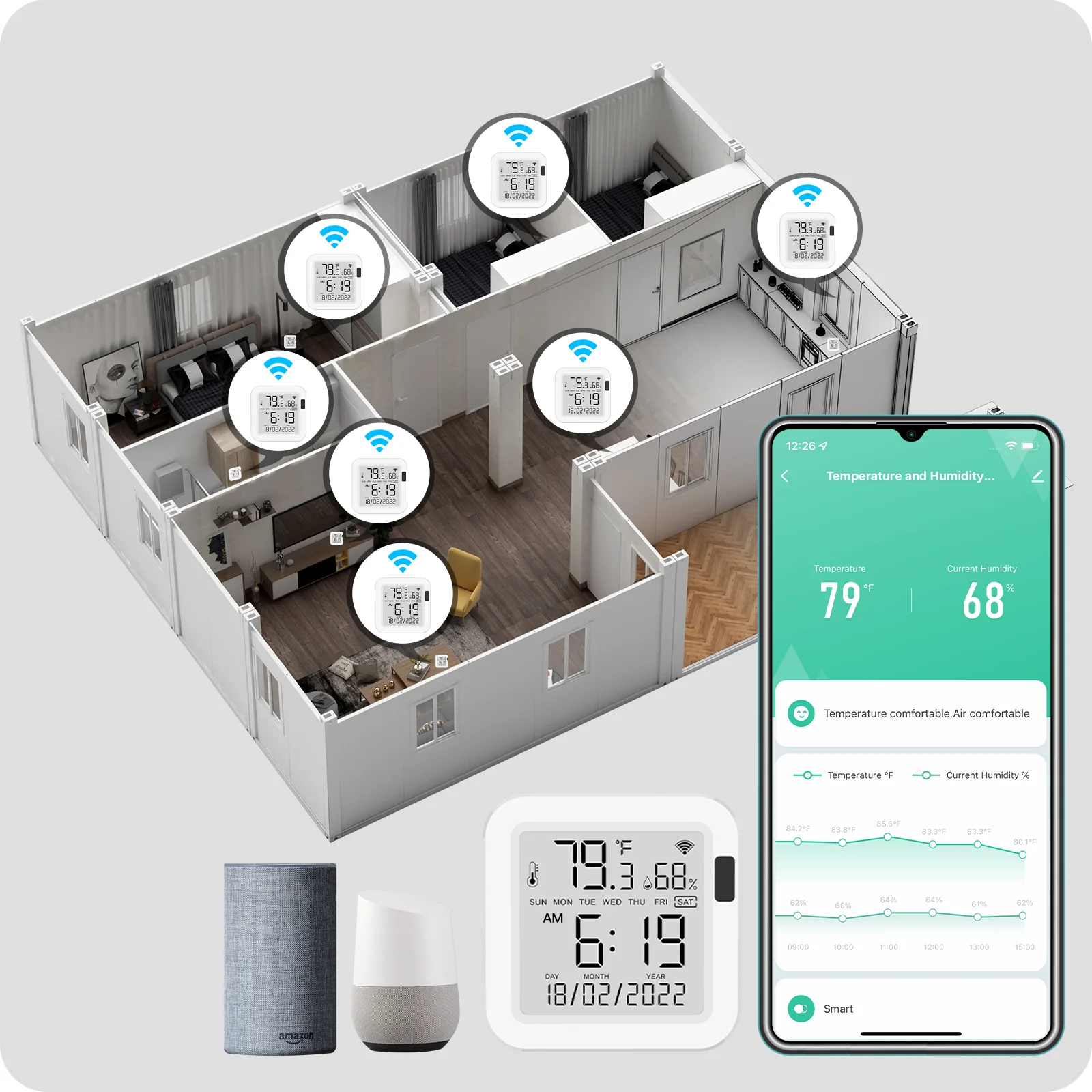 Seguimiento oportuno de la temperatura y la humedad de la casa para una condición ambiental más cómoda.